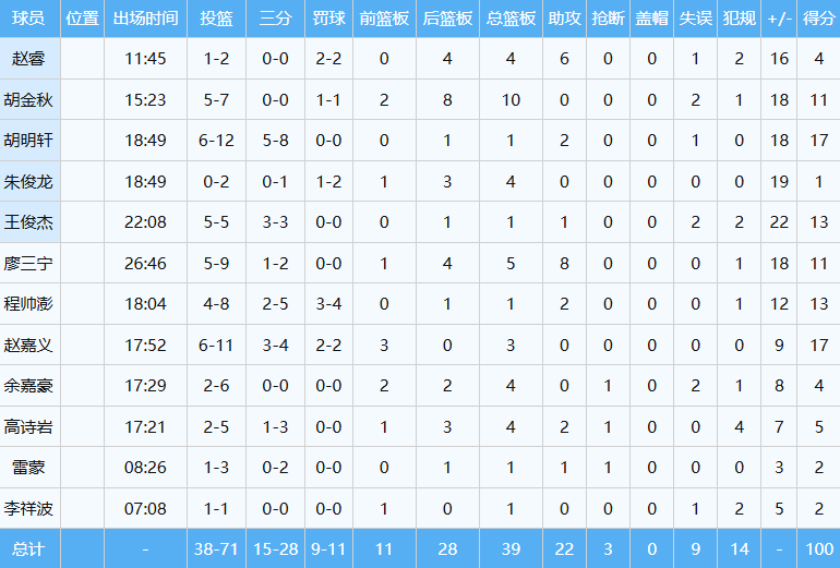 此役全员披挂上阵,并且都有得分进账,胡明轩17分,胡金秋11分10板两双到手,王俊杰三分球3中3拿下13分,廖三宁11分,程帅澎13分,赵嘉义17分。