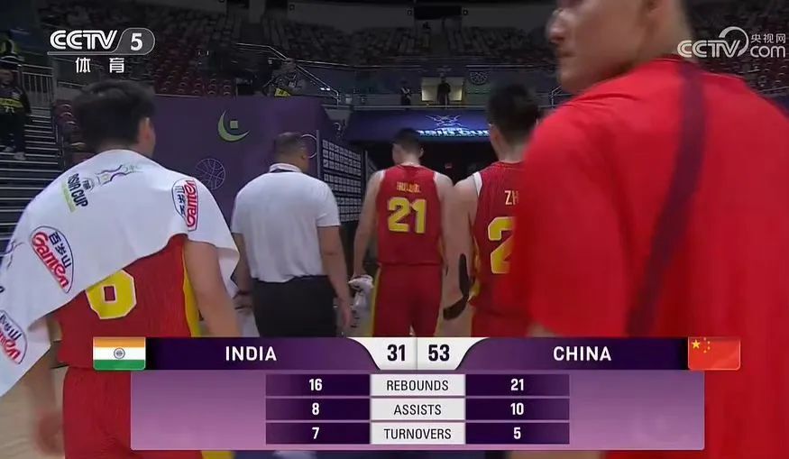 次节印度虽然有些调整,但中国男篮依然牢牢把握着场上节奏,上半场打完53-31大比分领先,净胜22分之多。